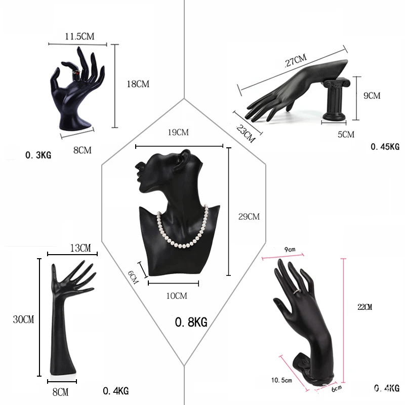 - Mains sculptées : parfaites pour exposer vos bagues, bracelets et montres.