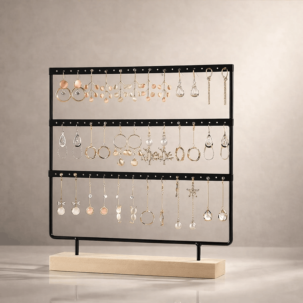 La structure du présentoir permet de suspendre et d’aligner les boucles d’oreilles de manière claire, évitant les enchevêtrements et facilitant le choix au quotidien. Son format compact et bien proportionné s’adapte aussi bien à un usage personnel qu’à une exposition professionnelle. Le design épuré assure une mise en valeur naturelle des bijoux, sans détourner l’attention de leur forme ou de leur finition.